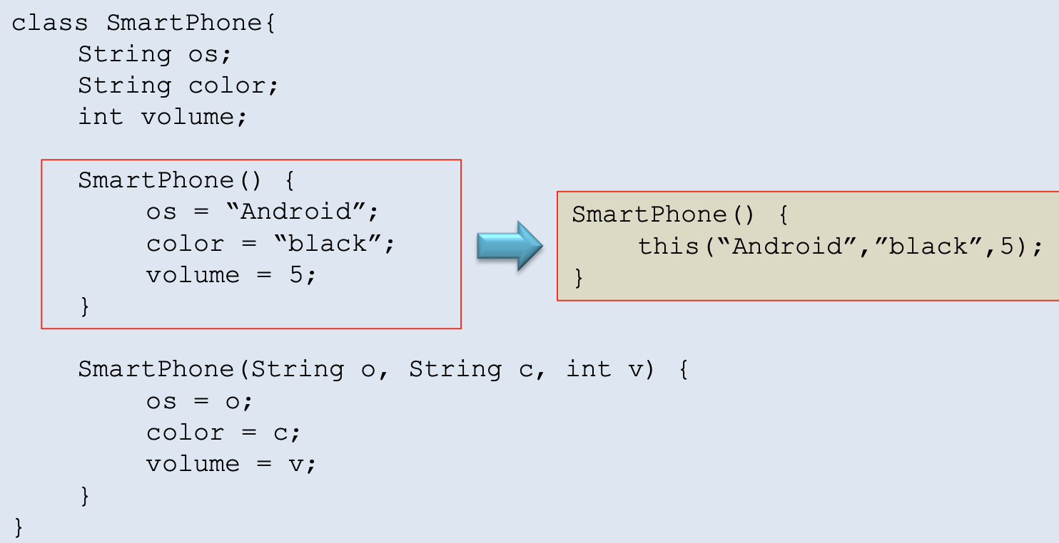 한 생성자에서 같은 클래스의 다른 생성자를 명시적으로 호출할 때 사용