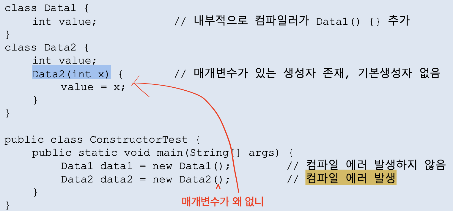 (모든 클래스에는 반드시 하나 이상의 생성자가 있어야 하므로)