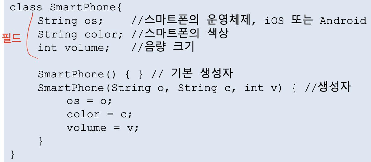 -인스턴스 변수: 필드, 객체가 가져야 하는 속성 값을 class 속에 마련