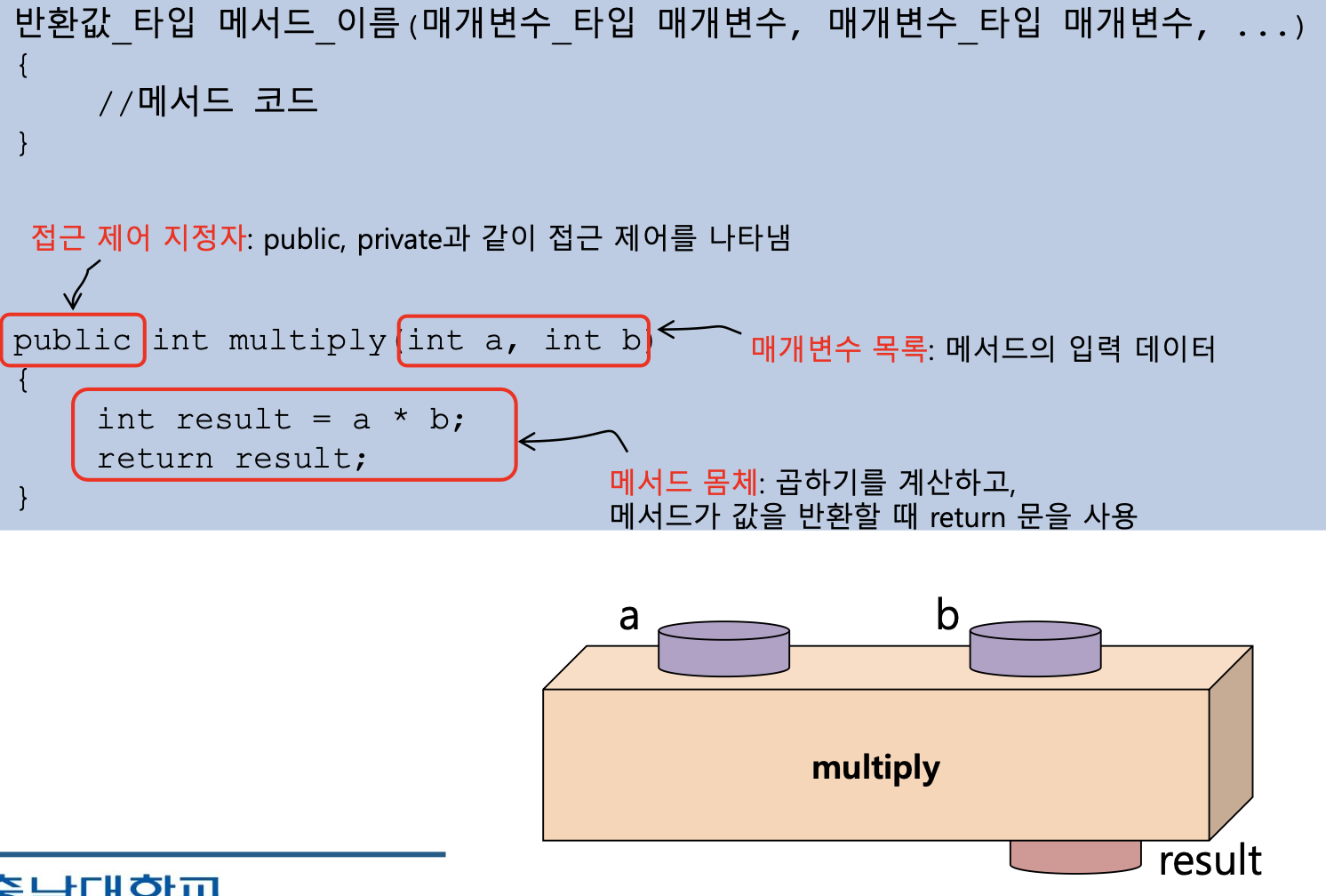 -하나의 메서드는 한 가지 기능만을 수행하도록 작성하는 것이 좋음 - 메서드의 구조