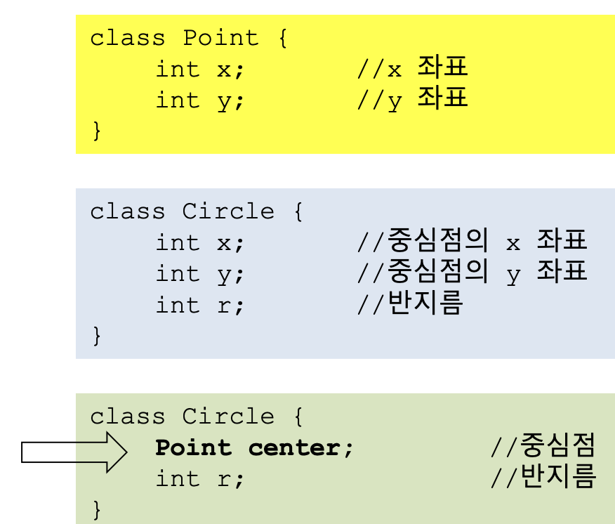 - 클래스의 멤버변수로 다른 클래스를 선언하는 것