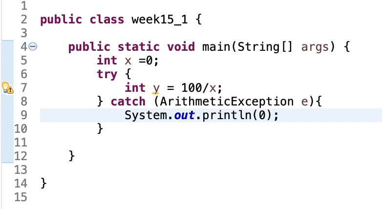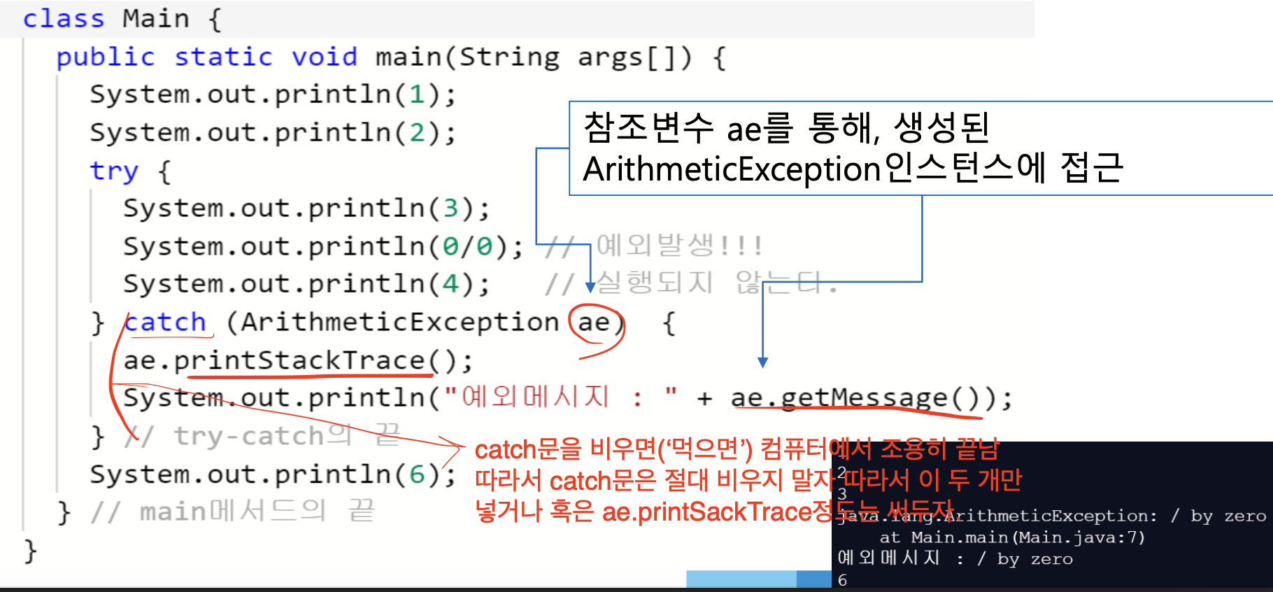 System.out.println(0/0); 에서 예외가 발생했으므로 try 블록을 바로 벗어남
