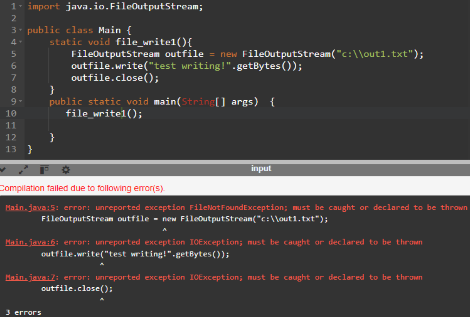 FileOutputStream outfile = new FileOutputStream("c:/out1.txt");