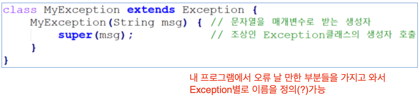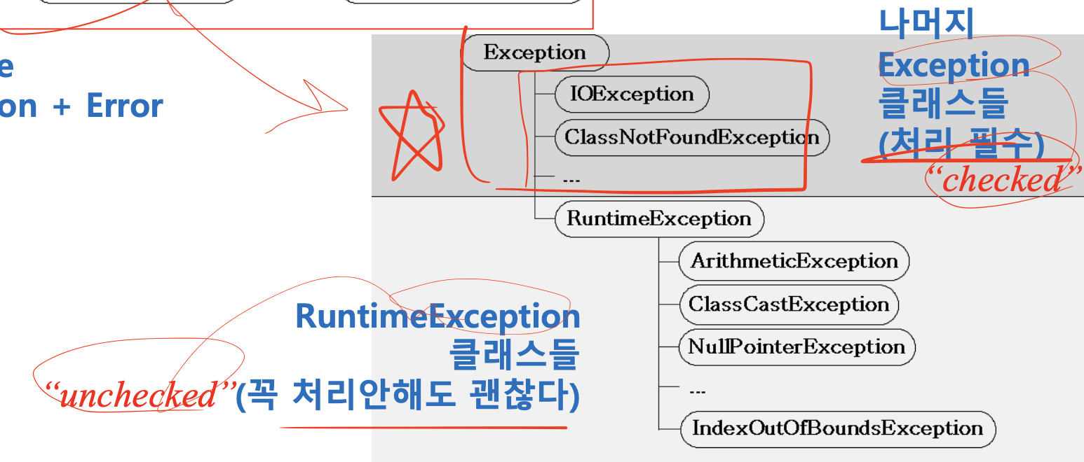 Java에서는 예외(Exception)도 객체이므로 클래스가 필요함 (오류(Error)도 객체)