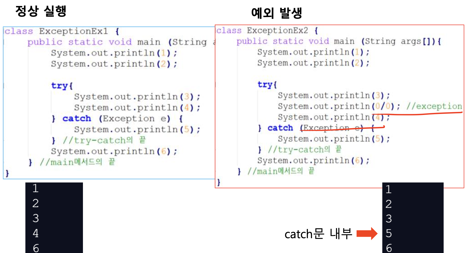 -> 전체 try-catch문을 벗어나서 다음 문장(System.out.println(6); 실행