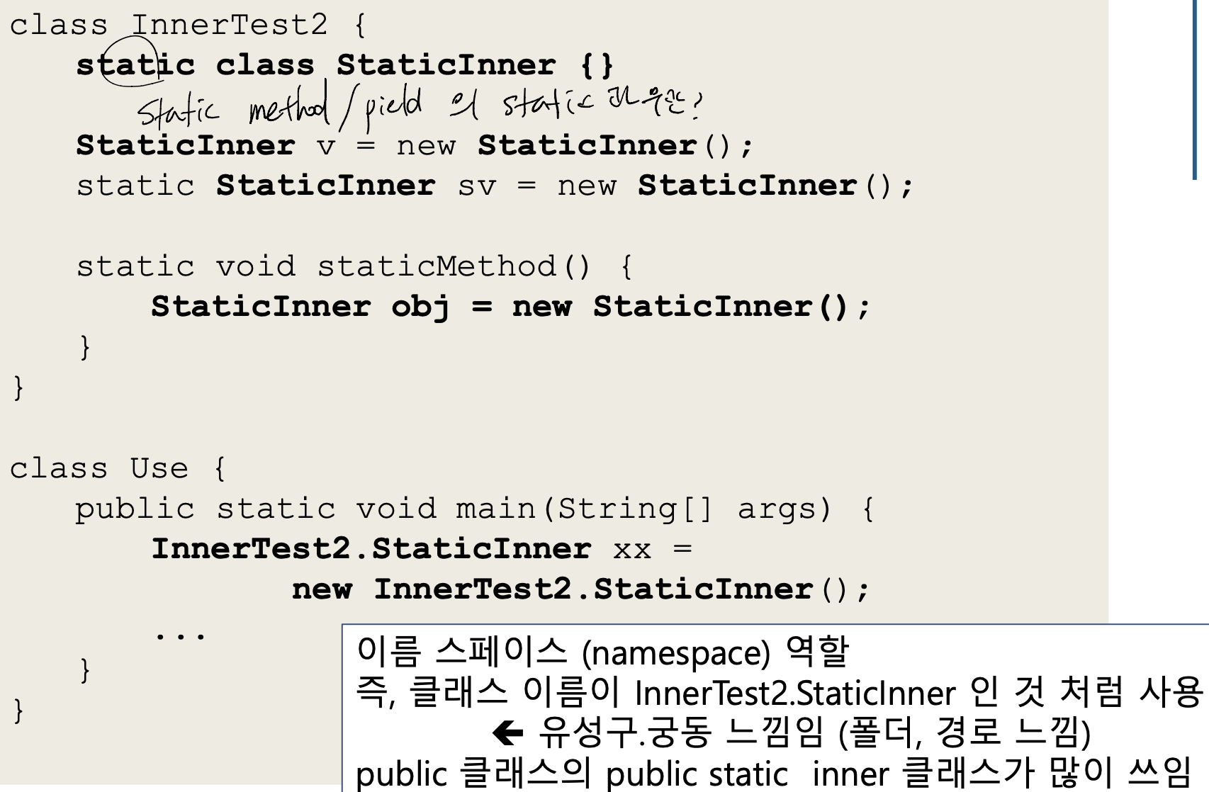 주로 외부 클래스의 static 멤버, 특히 static 메서드에서 사용될 목적으로 선언됨.