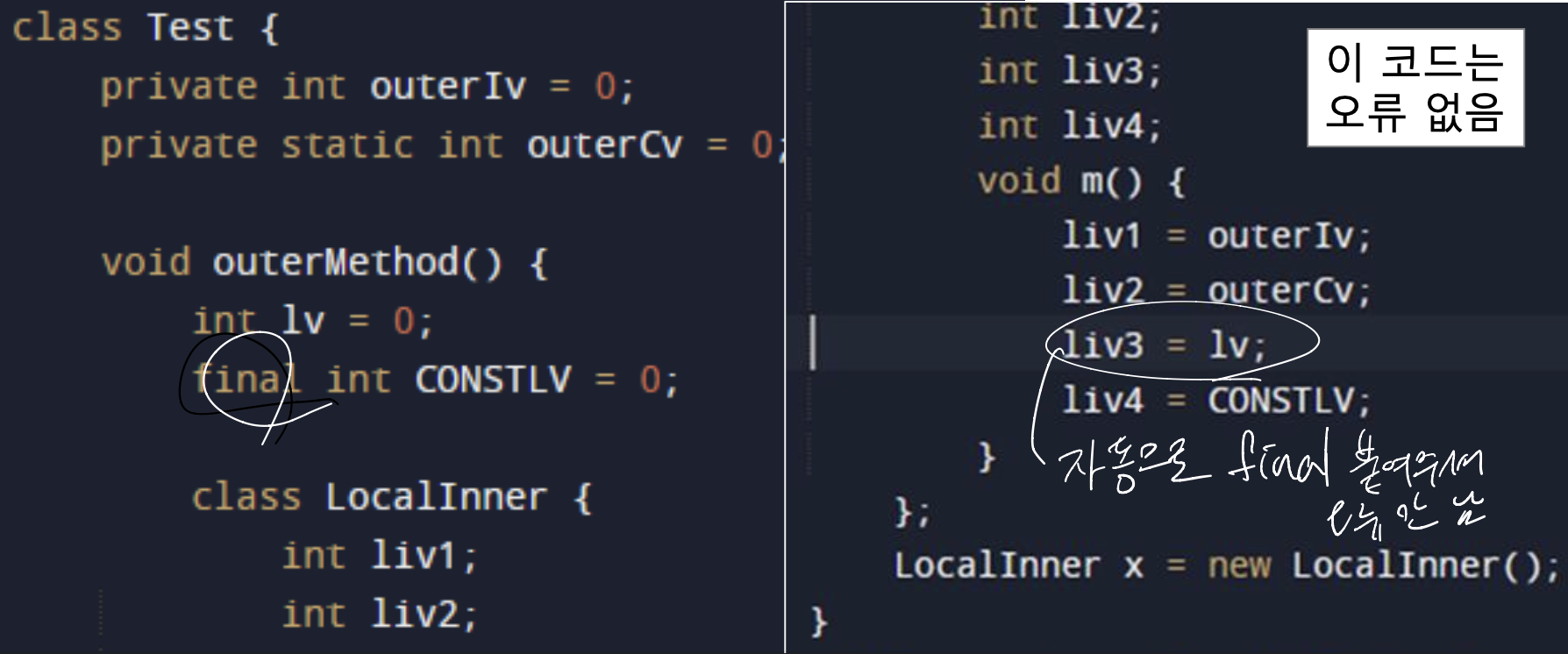 -추가로 지역 클래스가 포함된 메서드에 정의된 final 지역변수(상수)도 사용 가능 (private일지라도)\