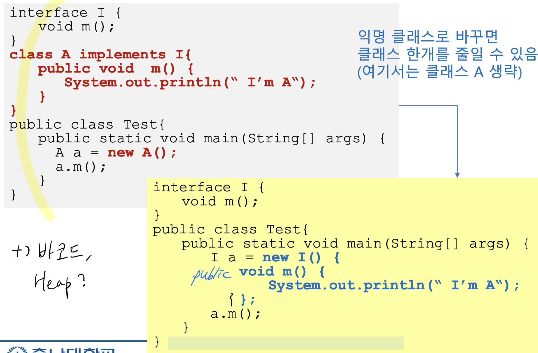 -익명 클래스: 클래스의 선언과 객체의 생성을 동시에 하는 이름없는 클래스(일회용)