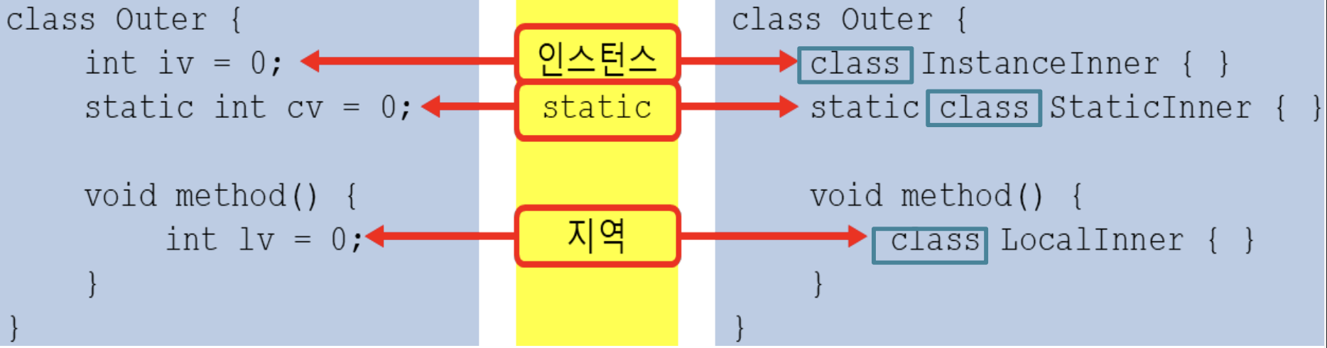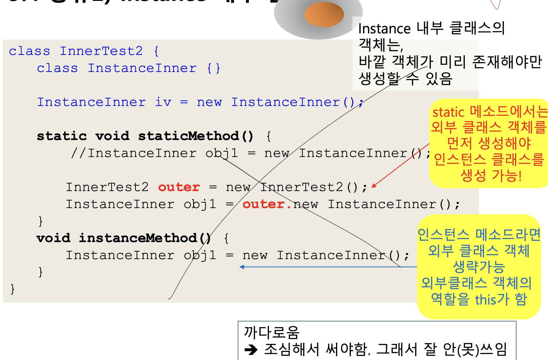 - Instance/instance 내부 클래스에서 외부 클래스의 인스턴스 변수, static 변수 모두 사용 가능*private 일지라도!