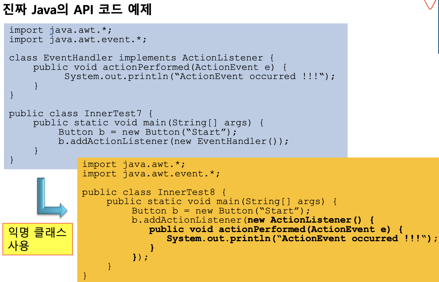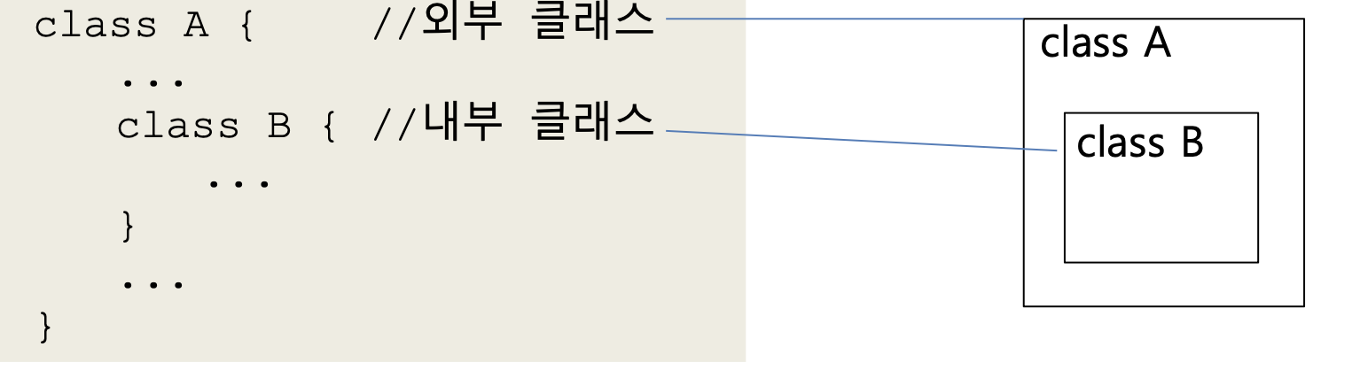 - 한 클래스를 다른 클래스의 내부 클래스로 선언하면